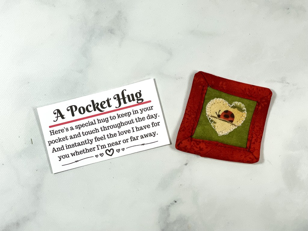 Pocket hugs are my favorite item to sell followed closely by corner bookmarks. The reason I love the pocket hugs is because they have an extra special sentimental and thoughtful vibe. The tiny quilted pocket trinket is super cute but they are thoughtful because of the poem card each buyer gets to choose to accompany the fabric hug. I have always loved giving meaningful gifts so I am so excited to have created something that so many are loving to give to loved ones.