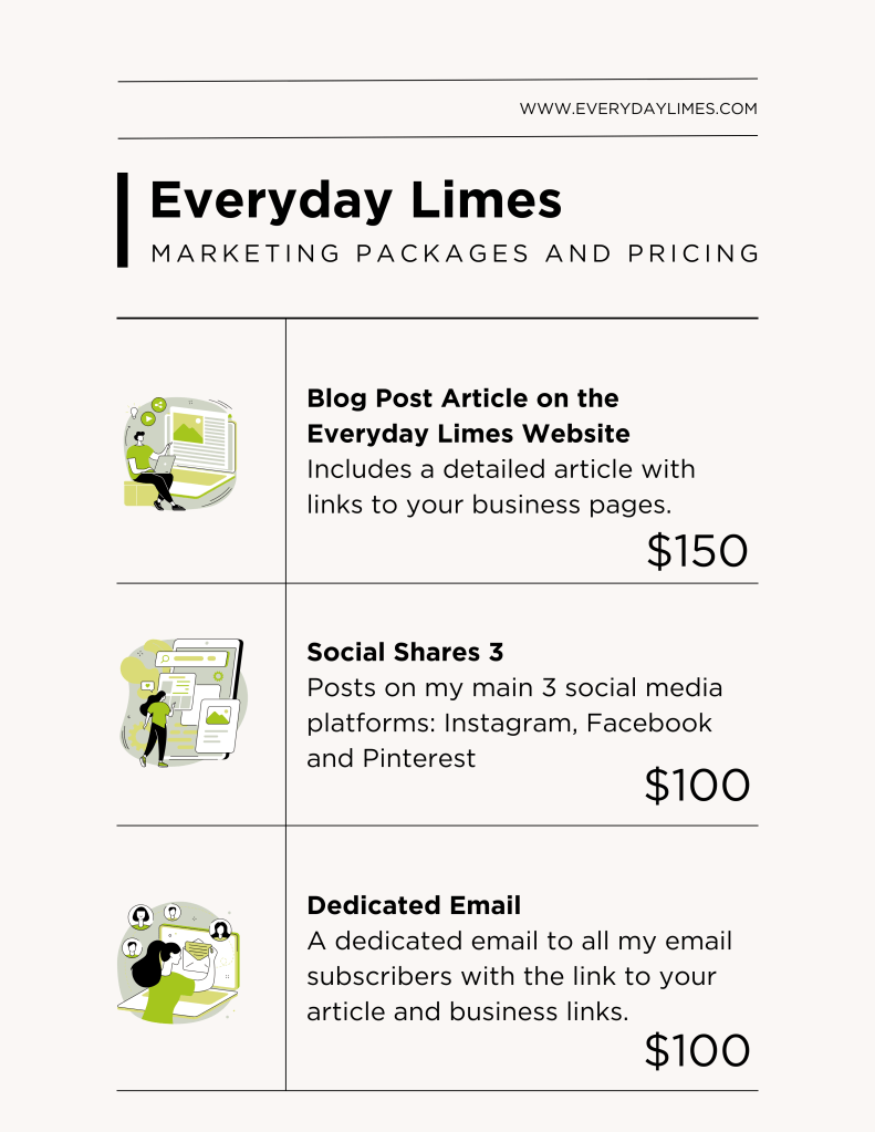 Looking for a way to expand your reach to a new audience of people who are looking for your products? Everyday Limes is a great way to advertise your business for a smaller investment. Get exposure to my full audience with a full package or pick and choose which level you want to spend. You can add on to your package at any time.